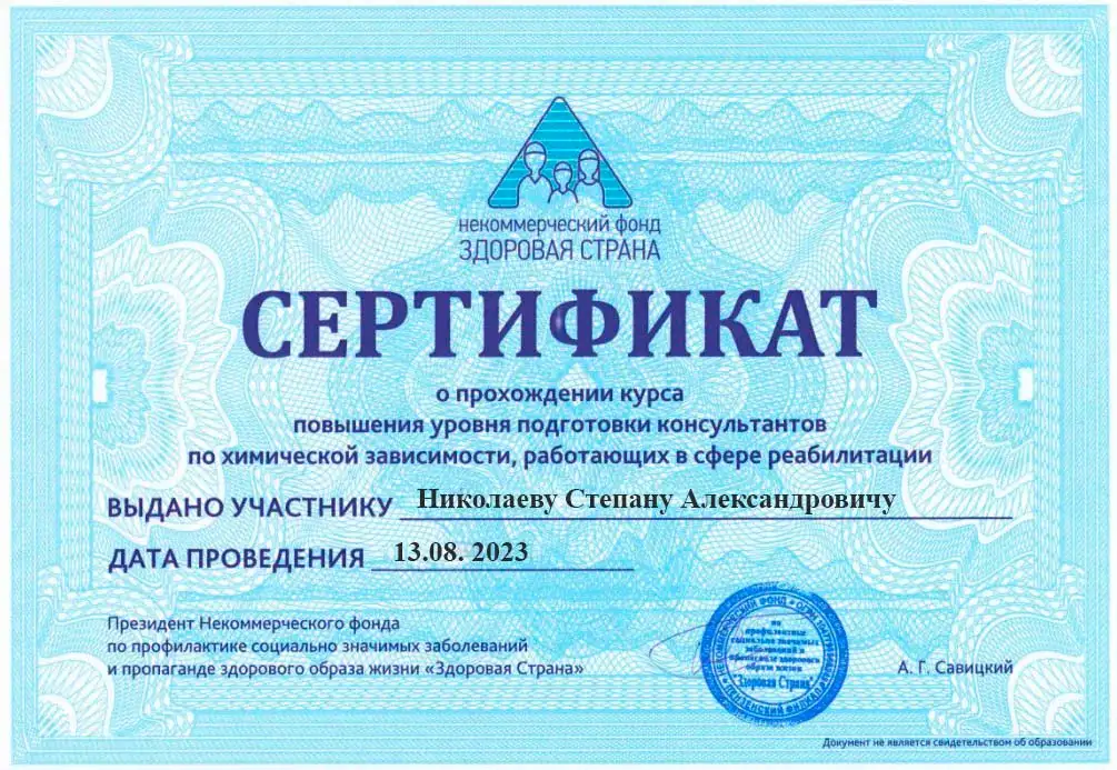 Консультант по химической зависимости Николаев Степан Александрович помогает мотивировать пациентов с алкогольной и наркотической зависимостью на прохождение лечения и реабилитации. В его задачи входит выявление актуальных проблем пациента, подбор оптимальных условий терапии и анализ динамики лечения.